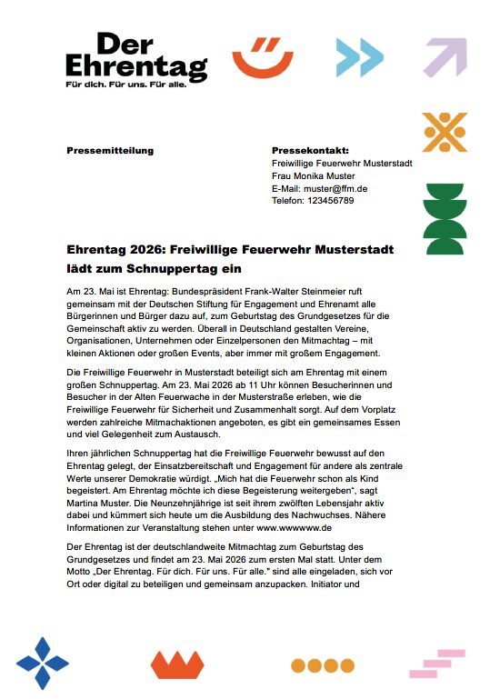 * Das Bundespräsidialamt und die Deutsche Stiftung für Engagement und Ehrenamt sind nicht verantwortlich für von Dritten erstellte Inhalte. Eine missbräuchliche Nutzung des Ehrentags-Corporate-Designs ist nicht zulässig.